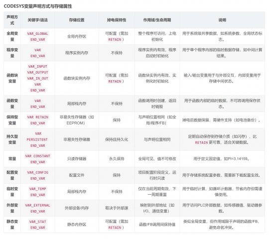 鍦–ODESYS涓紝鍙橀噺澹版槑鏂瑰紡鍙婂瓨鍌ㄥ睘鎬х敤浜庡畾涔夊彉閲忕殑浣滅敤鍩熴佺敓鍛藉懆鏈熷拰瀛樺偍浣嶇疆銆備互涓嬫槸CODESYS鏀寔鐨勪富瑕佸彉閲忓0鏄庢柟寮忓強鍏跺瓨鍌ㄥ睘鎬э細