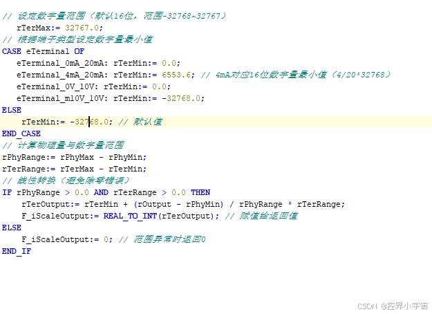 通过条件判断区分端子类型,计算数字量转换值,核心逻辑为“线性缩放”,代码如下: