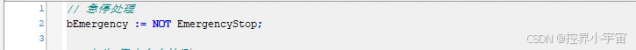 • 工业现场的急停按钮通常采用常闭触点(正常状态为TRUE,按下后为FALSE),因此通过NOT取反,使bEmergency=TRUE表示急停触发;