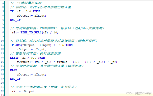 濮嬪寲閫昏緫锛氶娆¤皟鐢ㄦ椂_rT涓 0锛岀洿鎺ュ皢杈撳叆璧嬪肩粰杈撳嚭锛岄伩鍏嶅垵濮嬪煎紓甯革紱閲囨牱鍛ㄦ湡閫傞厤锛氫唬鐮佷腑/10瀵瑰簲 PLC 10ms 閲囨牱鍛ㄦ湡锛堥渶鏍规嵁瀹為檯纭欢璋冩暣锛夛紱瀹归敊澶勭悊锛氭椂闂村父鏁扳墹0 鏃剁洿鎺ヨ緭鍑鸿緭鍏ュ硷紝閬垮厤闄ら浂閿欒锛涚姸鎬佷繚鎸侊細_rY淇濆瓨褰撳墠杈撳嚭锛屼綔涓轰笅涓鍛ㄦ湡鐨勫巻鍙插硷紝瀹炵幇杩炵画骞虫粦婊ゆ尝銆