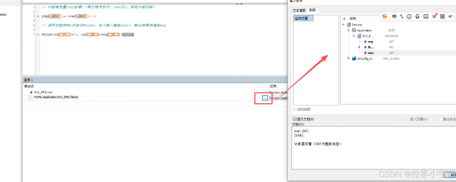 点击表达式第一行激活编辑框。输入变量完整路径(如PLCWinNT.Application.PLC_PRG.Ivar),建议点击「输入助手」自动生成路径,避免手动输入错误。