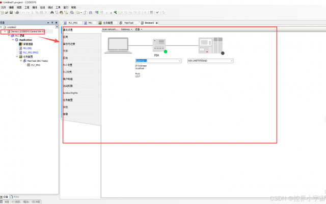 启动 Gateway Server(通讯桥梁)和 PLC 服务(目标设备);激活工程中的应用,让通讯命令关联到该应用;建立 CoDeSys 编程系统与 PLC 设备的 TCP/IP 连接;