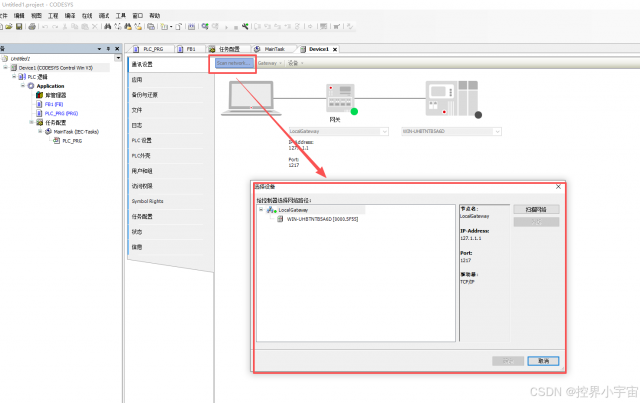 在通讯设置对话框中,选中刚添加的本地网关(如 “Local Gateway”);点击「扫描网络」按钮,CoDeSys 会通过网关搜索本地网络中的可用 PLC;